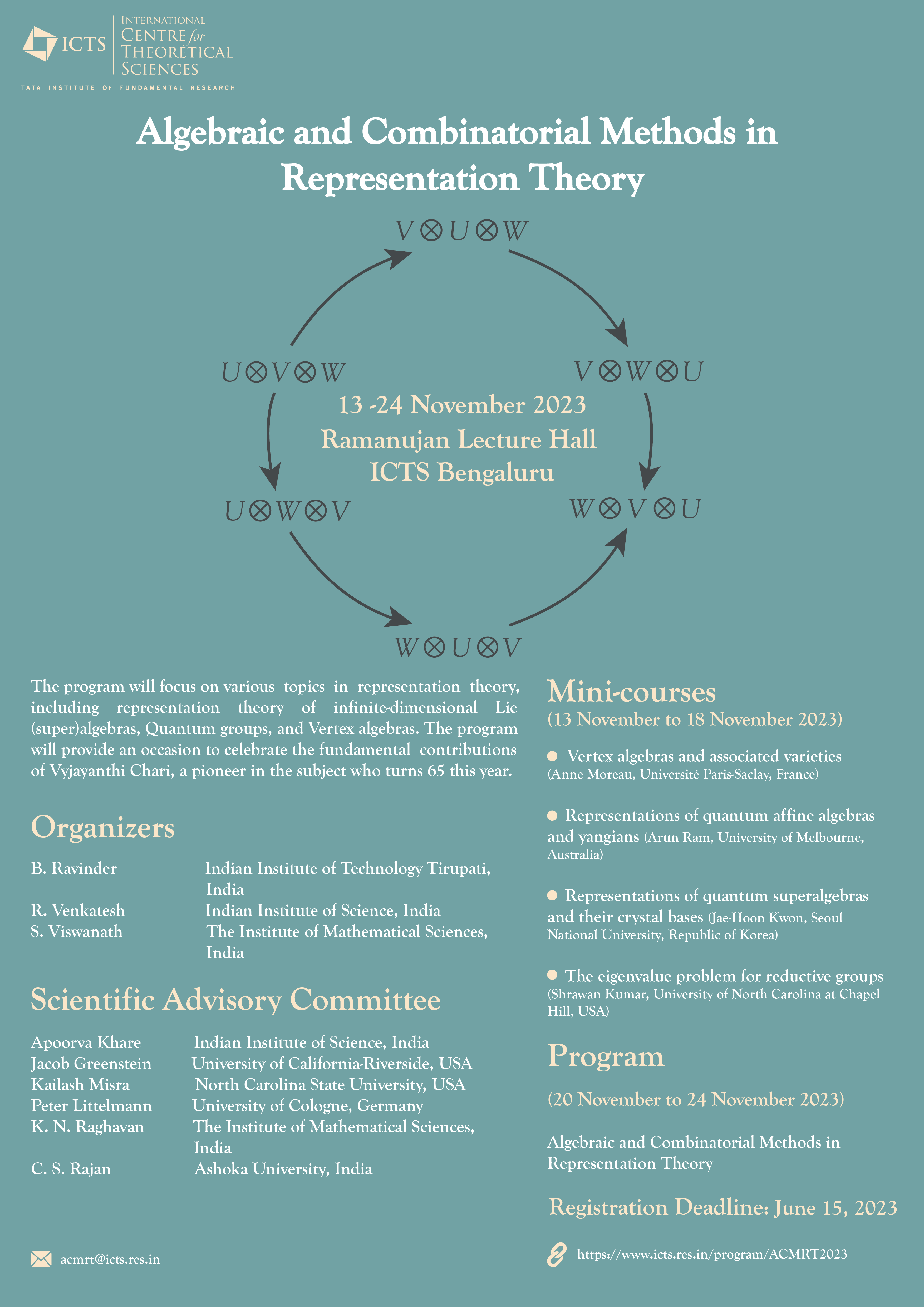 The International Center for Theoretical Sciences, Tata Institute of Fundamental Research is hosting the conference Algebraic and Combinatorial Methods in Representation Theory in honor of the 65th birthday of Distinguished Professor Vyjayanthi Chari. The Mathematics Department congratulates Professor Chari on her remarkable career and wishes her continued success.